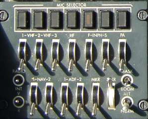![]() Audio Control PanelThis type of ACP has cylindrical button volume controls, others have sliders.Radio/Int works in the same way as the rocker switch on the control column. ie in the INT position bypasses the mic selector to transmit on the flt interphone. The filter switch, Voice-Both-Range, allows better reception of either voice or morse identifiers on NAV & ADF radios. Check that this switch has not been left in the V position if you can't get an ident. Mask/Boom simply selects either mask or boom mic. Check this if nobody can hear you transmit - especially after your oxy mask mic check! Alt/Norm in the ALT position puts the ACP into degraded mode. If the Capts ACP is in degraded mode, he can only transmit on VHF1 through mask or boom and can only receive VHF1 at a preset level. The F/O's ACP in degraded mode is the same but uses VHF2. Note aural warnings will still be heard over the speaker. |