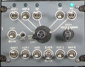 ![]() VHF RadioMost 737's have three VHF radios and at least one HF radio. This unit allows for selection of any of those at this station. The TEST button is a squelch and is used to hear faint stations that do not have the strength to breakthrough. If you switch the panel OFF at the same time as TEST is applied this holds the test condition thereby allowing you to hear faint stations without having to hold down the test button - very useful for copying distant weather! |