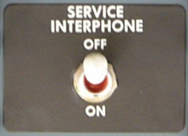 ![]() Service InterphoneThe switch on the aft overhead panel activates the external jacks to the service interphone system. Normal internal service interphone operation is unaffected by switch position. |